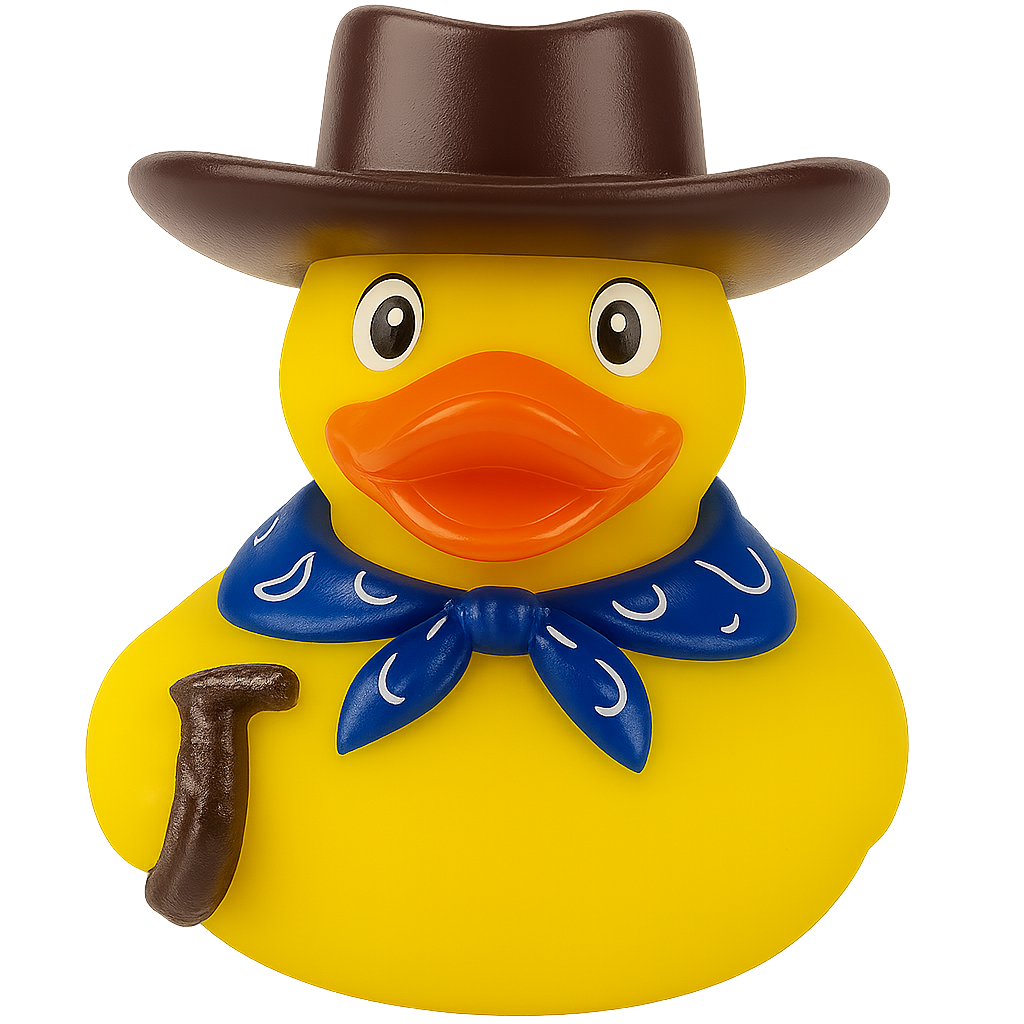 cowboy duck – ready to lasso some fun! With a brown hat, a green bandana,...