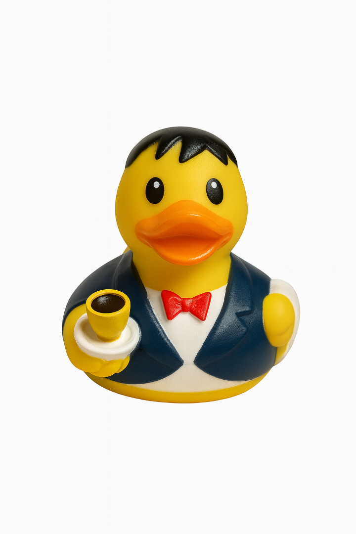 Yellow (waiter) Rubber Duck 8cm , he’s ready to bring class, charm, and caffeine wherever...